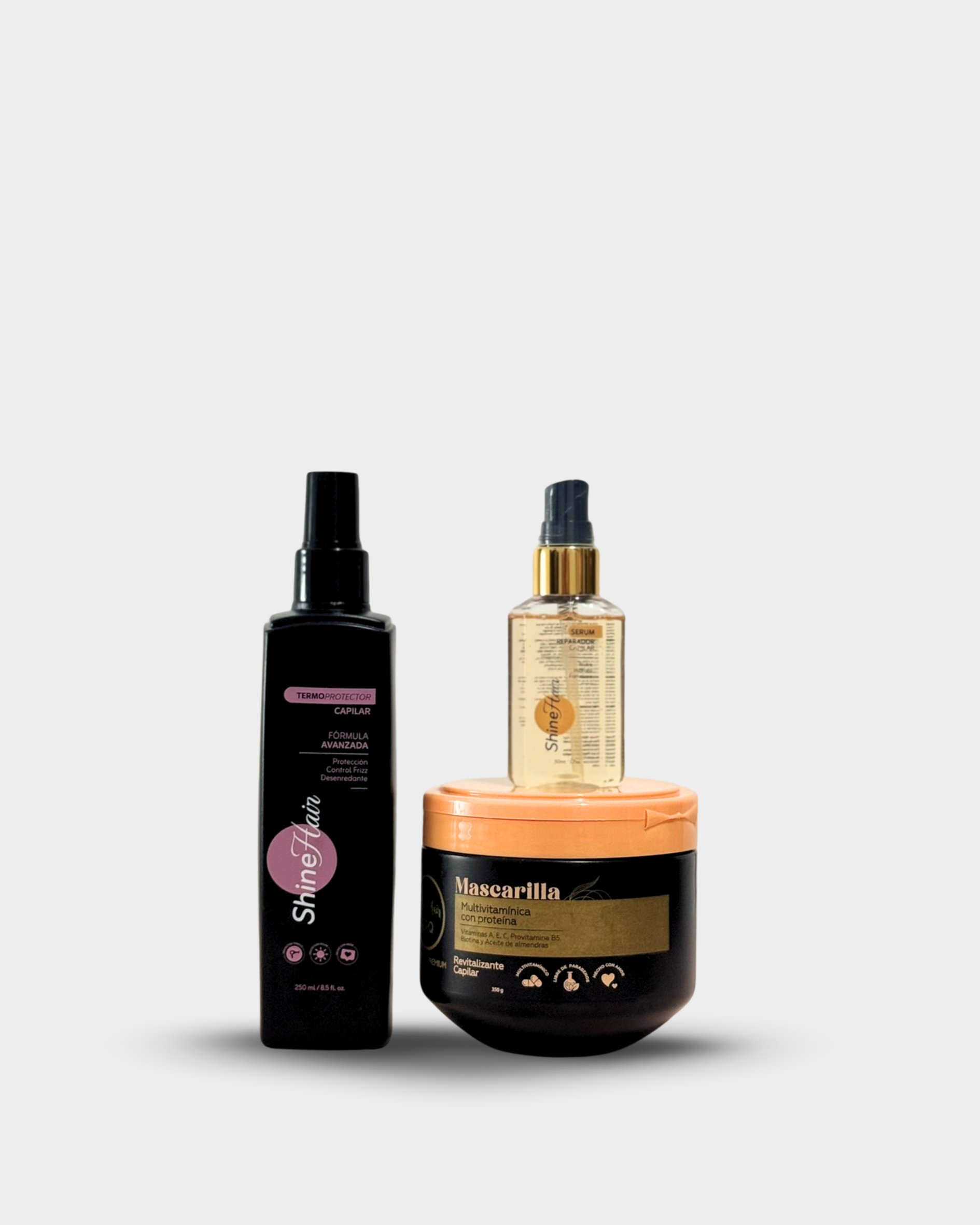 Este kit está pensado para cabellos maltratados, quemados por plancha/secador o procedimientos químicos. La mascarilla multivitamínica restaura la fibra desde adentro con vitaminas, proteínas y aminoácidos. El termo protector protege del calor, reduce frizz y evita el quiebre y la resequedad. El serum reparador de puntas sella la cutícula, aporta brillo espejo y mejora la textura del cabello desde el primer uso.